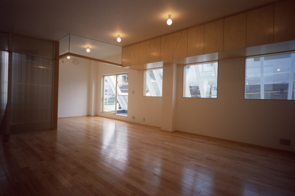 親世帯LD:西より。天井の鏡は上階小世帯小窓。