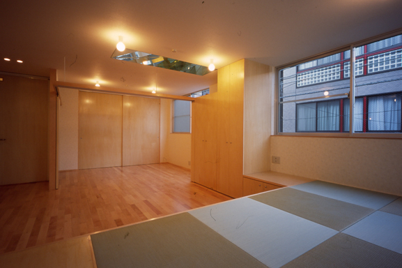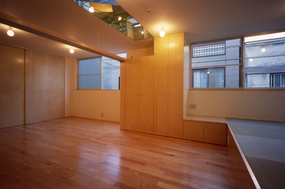 ここではワンフロアにワン機能を原則に廊下をなくしワンルームを縦積みすることでホームEVとあわせてバリアフリーとしました。さらに三方が建物に囲まれることから前面道路と空に向かい開口部という"孔"を開け採光通風を確保し、内部は竪穴区画により空気の流通が制限されるため吹抜けでなく室内トップライト等の"窓"を設け光や気配がつながるようにしました。室内トップライトは実際の鏡により、建物最上部トップライトは夜間ハーフミラーシートにより、それぞれ万華鏡効果を挙げています。