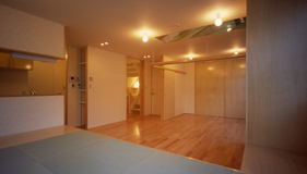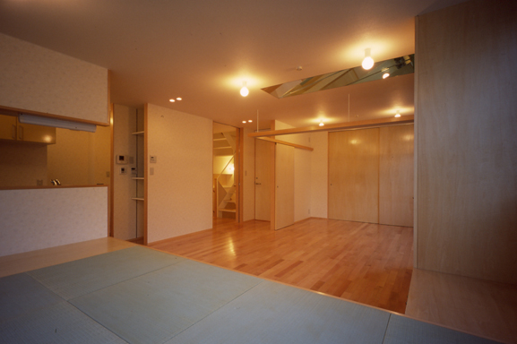 親世帯LD:南西より。奥は仕切ると寝室に。畳エリアは下部収納。